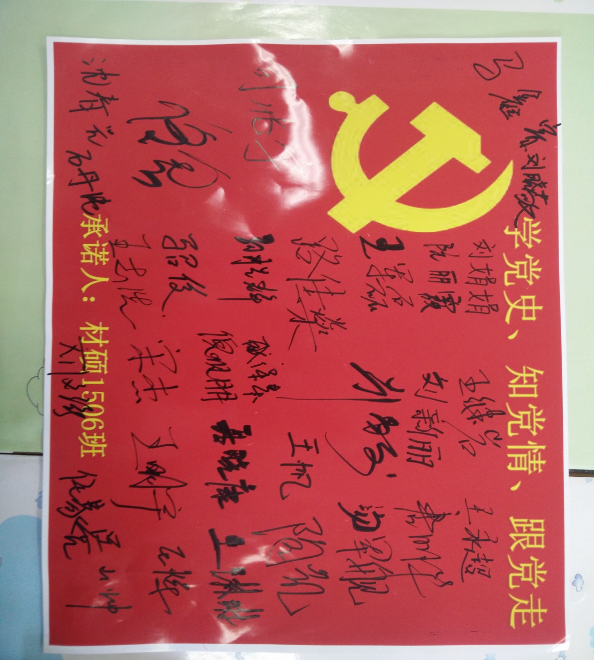 材硕1506支部于2016年6月5日于机电馆202召开主题为“学党史、知党情、跟党走”主题活动。支部全体党员、积极分子、部分入党申请人参加本次活动。活动紧密围绕着“两学一做”主题教育活动思想,进行了党史知识竞赛、重温入党誓词、唱红歌党旗签名等活动。通过丰富多彩的活动,支部的党员和积极分子对两学一做系列教育有了更深刻的认识,对党的历史、现状和自身的行动方向有了更明确的了解。