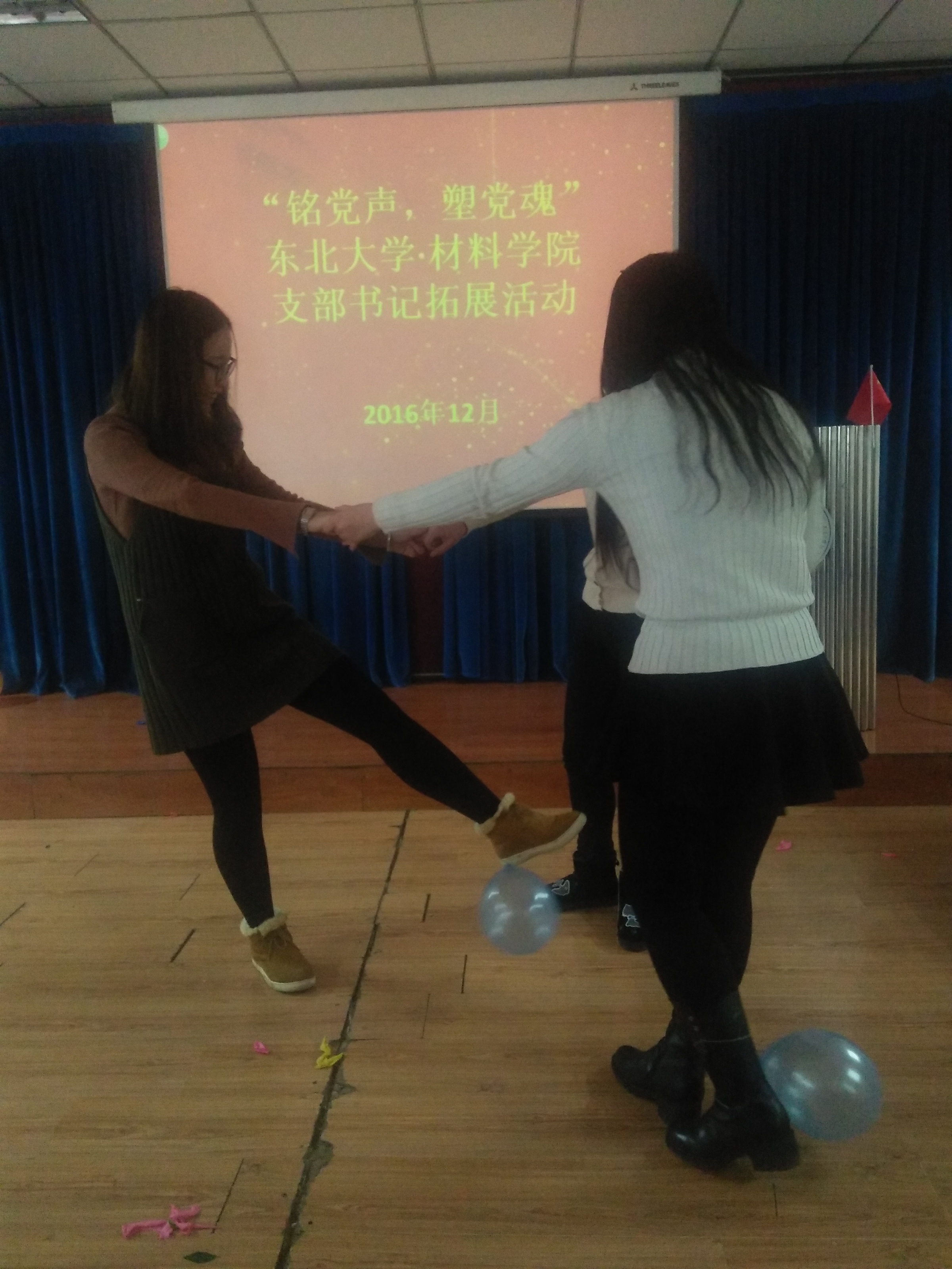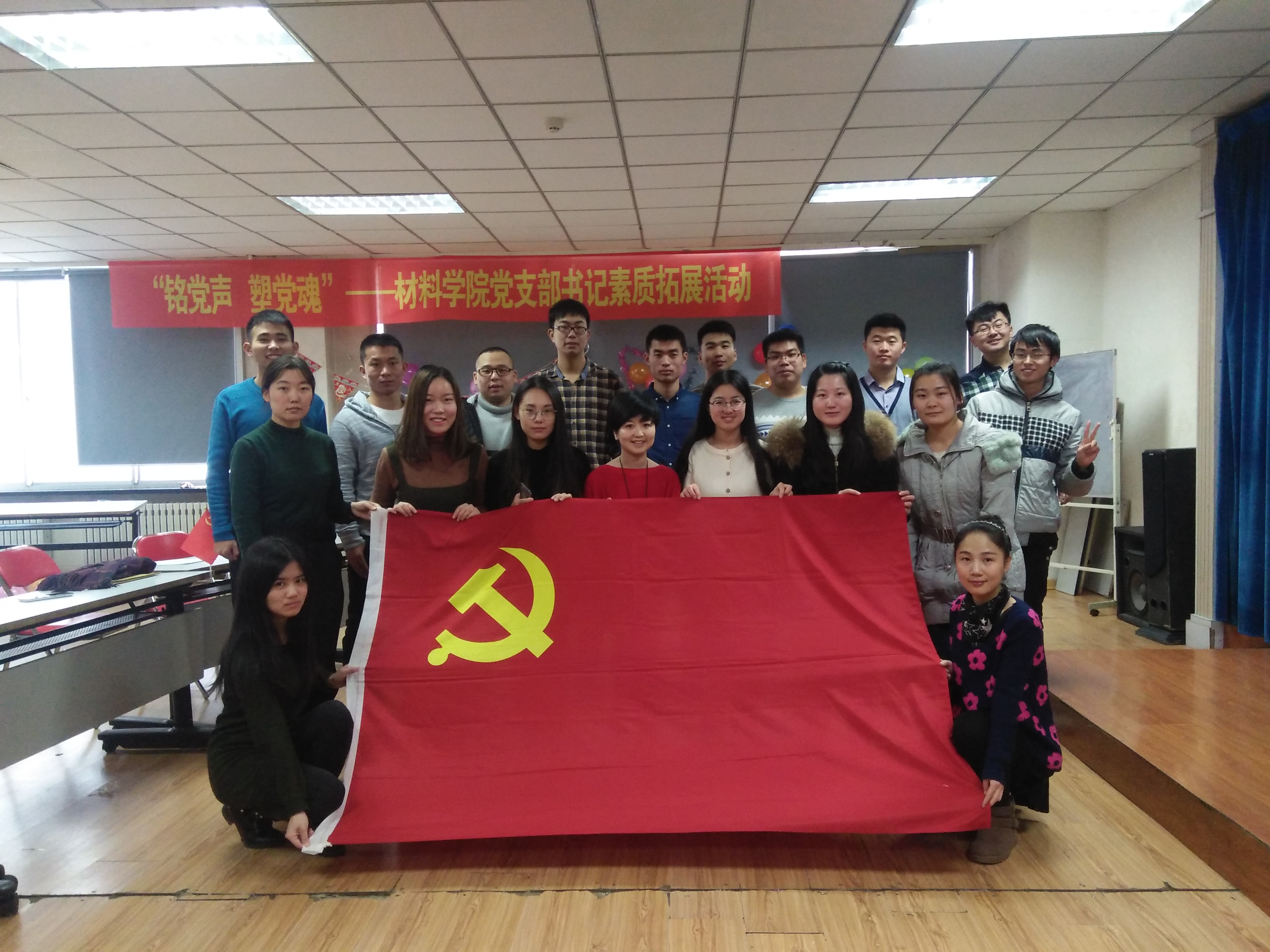 新年钟声的即将敲响,为对本年度材料学院的各个党支部工作进行总结,更好的制定下一年的工作计划的同时丰富党支部书记的日常生活,增进材料学院各党支部的之间的交流和沟通,材料学院学生党总支于2016年12月28日在大活300室举办了“铭党声 塑党魂”的素质拓展活动,活动过程跌宕起伏,欢声笑语不断。