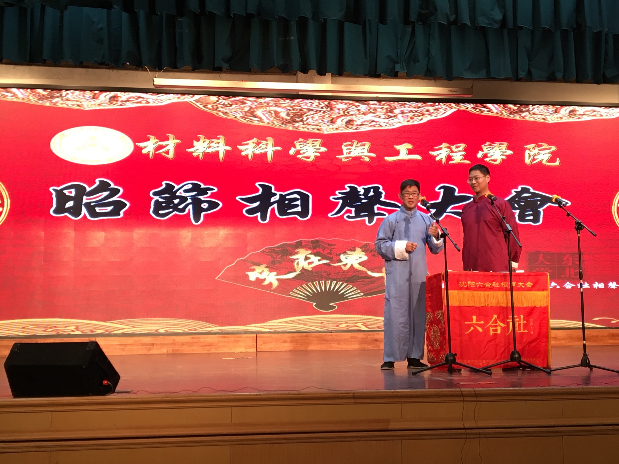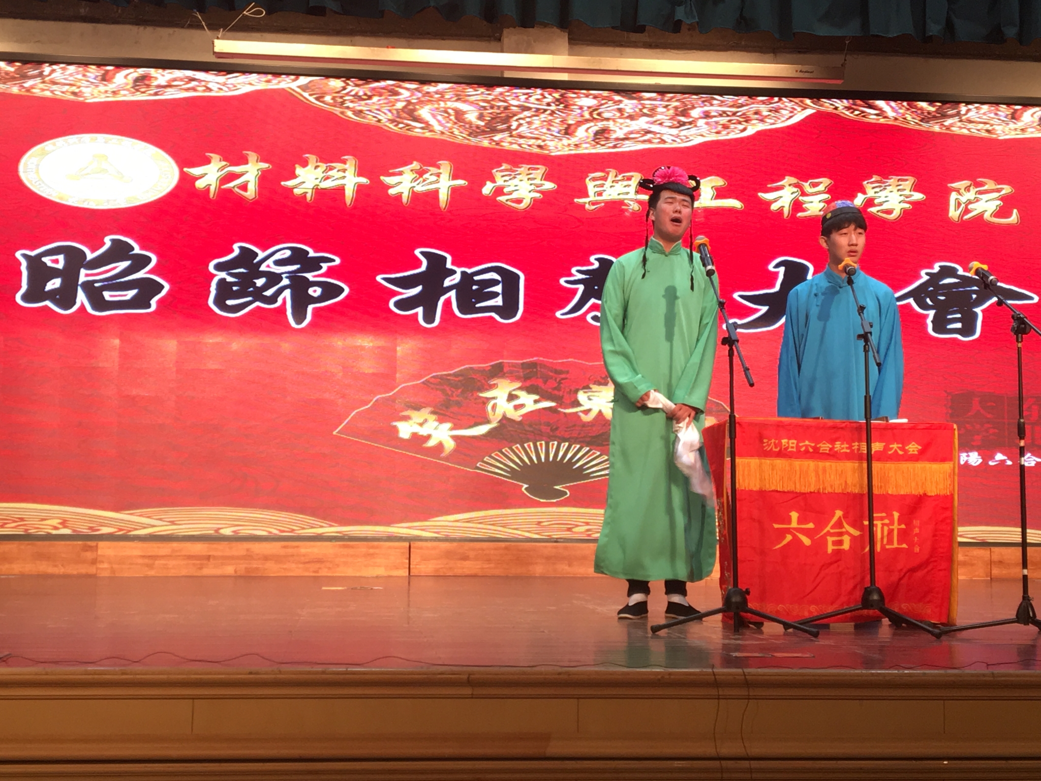 首先暖场的是来自材料学院修伟和他的搭档葛鹏宇的拿手节目《学唱小曲》,两人学唱东北二人转,一唱一和,将子母哏穿插其中,一展材料学院的风采。接下来两个节目是由沈阳本土民营相声团体“六合社”带来的,赵杨、王子淮的《欢歌笑语》,两位年轻的相声演员的表演可圈可点,尤其模仿琼瑶剧的场景让人印象深刻,两人的表演加入音乐、舞美元素,相声表演更加多元化,可谓一大创新。接下来是有胡景泰、王忠实带来的《歪批童话》,将外国经典童话再次演绎,实在令人忍俊不禁,让人在捧腹大笑的同时略有思考。紧跟而来是英雄出少年的表演者孙一夫及其搭档王宸为我们带来的是《黄金梦》,两人默契的配合、与台下观众密切的互动,使现场气氛达到小高潮。接着,六合社的社长辛宇也亲自上阵,为我们带来了精彩的《如此聘用》,同时还伴随着现场抽奖,为幸运观众赠送六合社的门票,全场观众的气氛迎来了高潮。相声专场最后登场的用专业术语来说叫做“攒底”也就是所谓的“大轴” 王洋、洪兆宇为我们带来的《礼仪漫谈》,扎实的基本功、充足的舞台经验可见一斑。同学们在欢声笑语中充分体会到了传统文化的魅力,掌声此起彼伏。更有甚者,直接用手机开起了直播。