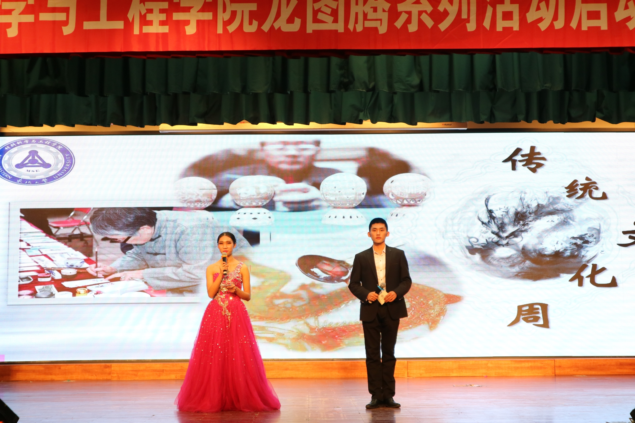 启动仪式伊始,主持人向同学们详细介绍了材料学院品牌活动—— “龙图腾”系列活动,回顾了过去一年“龙图腾”系列活动内容:传统文化体验周,励志东大人物访谈,风筝节等,同时对今年“龙图腾”系列活动的策划进行了介绍。随后伴随着欢快的乐曲,主持人隆重宣布东北大学材料科学与工程学院龙图腾系列活动启动仪式暨昭节相声大会正式开始。