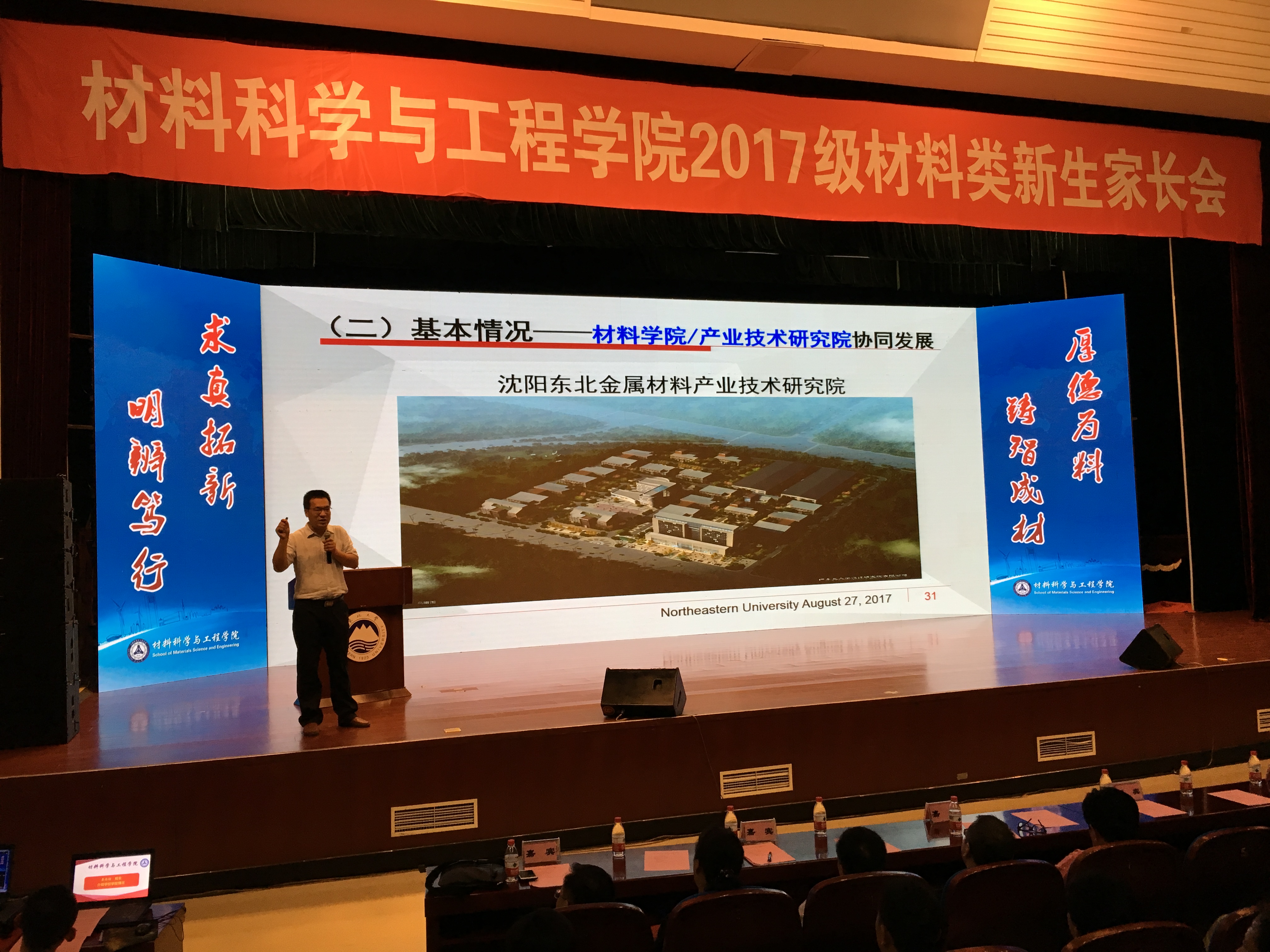 2017年8月27日,在隆重热情、安全有序、温馨幸福、富有文化底蕴的迎新工作氛围同时,材料学院于汉卿会堂蔡冠深报告厅顺利举行2017级材料类新生家长会暨班导师聘任大会。材料学院院长秦高梧,党委书记张玉宝,国家重点实验室主任王昭东,副院长蒋敏、祁阳、赵志浩,副书记兼副院长贺翔,学院工会主席王建军,材料系、材料加工系、材料物理与化学系等各系主任及副主任,2017级新生班导师、学生工作办公室全体老师、2017级材料类新生家长参加本次会议。