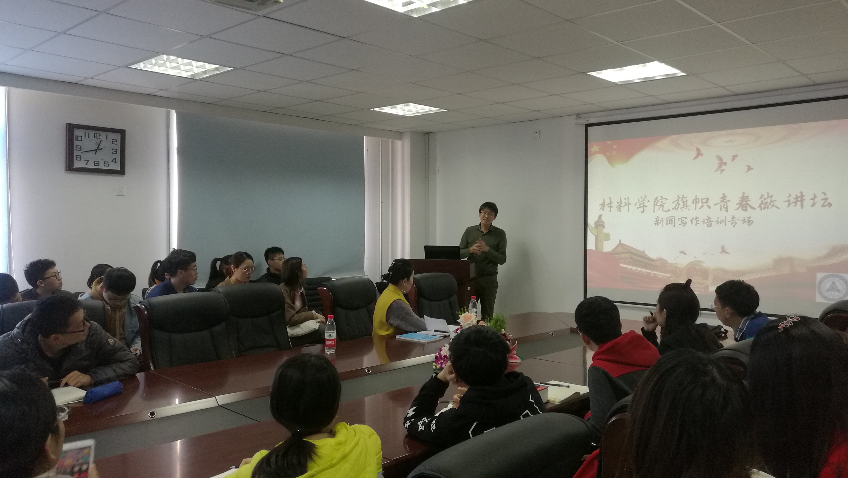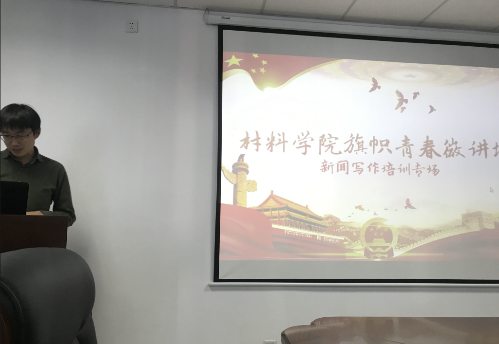 为了更好的加强党支部建设,推动支部宣传工作,提升党员干部写作能力,10月31日中午,材料学院学生党总支在知行楼424进行“旗帜青春微讲坛---新闻写作培训”。东北大学宣传部网络宣传办公室主任李家祥、材料学院党委组织员商淼和材料学院全体学生党支部书记、宣传委员和新闻采编员参加活动。