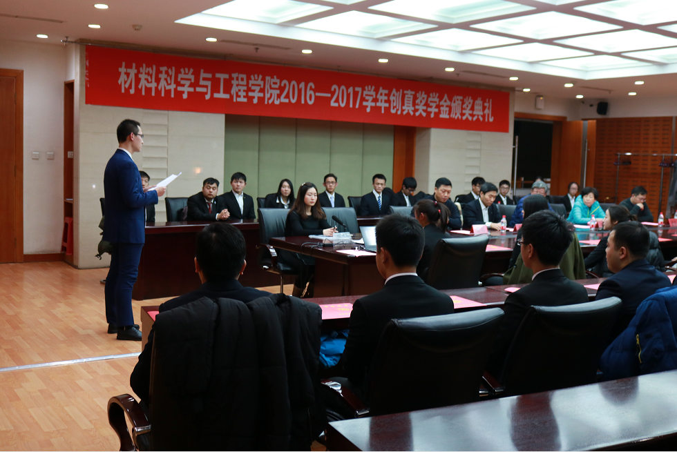 12月1日晚6时30分,材料科学与工程学院于汉卿会堂308举办了材料学院2016-2017学年创真奖学金颁奖典礼。天津创真金属科技有限公司董事长于铁生,天津创真金属科技有限公司副总经理姜敬东,东北大学对外联络与合作处处长李鹤,新材料技术研究院院长王磊,材料学院党委副书记兼副院长贺翔出席了典礼。学生工作办公室主任杨明凤主持典礼。
