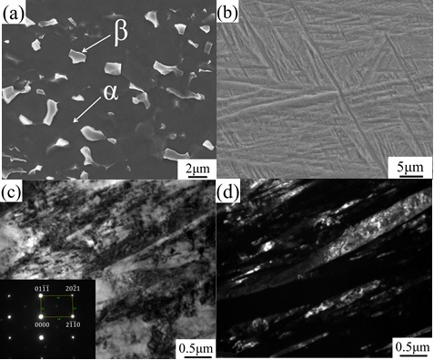 (a)原始组织(SEM);(b)~(d)热处理后组织:(b)SEM;(c)TEM明场像;(d)TEM暗场像