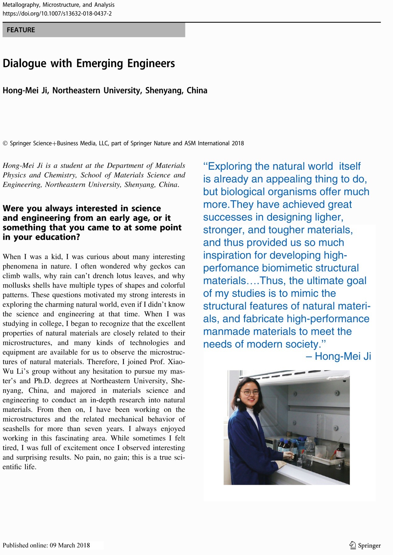 国际杂志《Metallography, Microstructure, and Analysis》对我院博士生季洪梅同学进行了采访,并以“Dialogue with Emerging Engineers”(对话新兴工程师)为题,将专访发表在该期刊上。