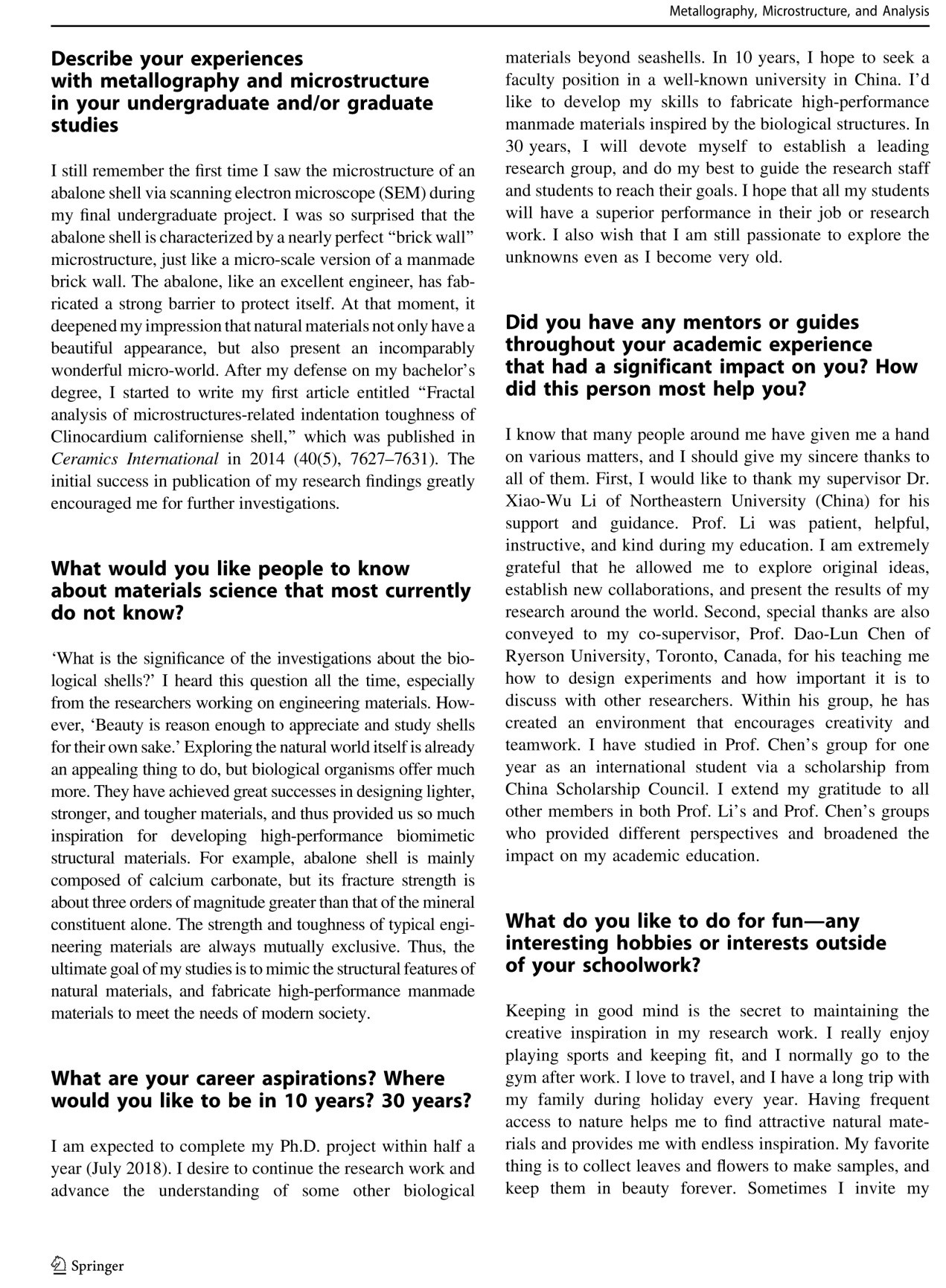 国际杂志《Metallography, Microstructure, and Analysis》对我院博士生季洪梅同学进行了采访,并以“Dialogue with Emerging Engineers”(对话新兴工程师)为题,将专访发表在该期刊上。