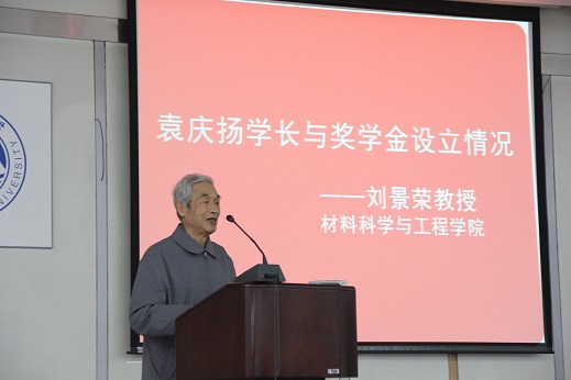 刘景荣老先生向与会师生讲述了袁庆扬学长奖学金的设立经过,他说袁庆扬老先生的老师是原材料专业李见教授,为了回报李见老师的教导以及多年来在东北大学学习和工作中获得的知识,同时他对东北大学的材料学子也怀有殷切的期望,因此设立了李见-袁庆扬奖学金。刘老先生通过讲述自己与袁庆扬学长接触共事的过程,向同学与老师们展示了一个朴素、热情的袁庆扬学长形象。他强调李见-袁庆扬奖学金的来源并不富裕,作为工程师的袁庆扬教授从自身薪水中出资设立的这个奖学金,体现出了袁老先生对材料后辈的大力支持和深情关怀。