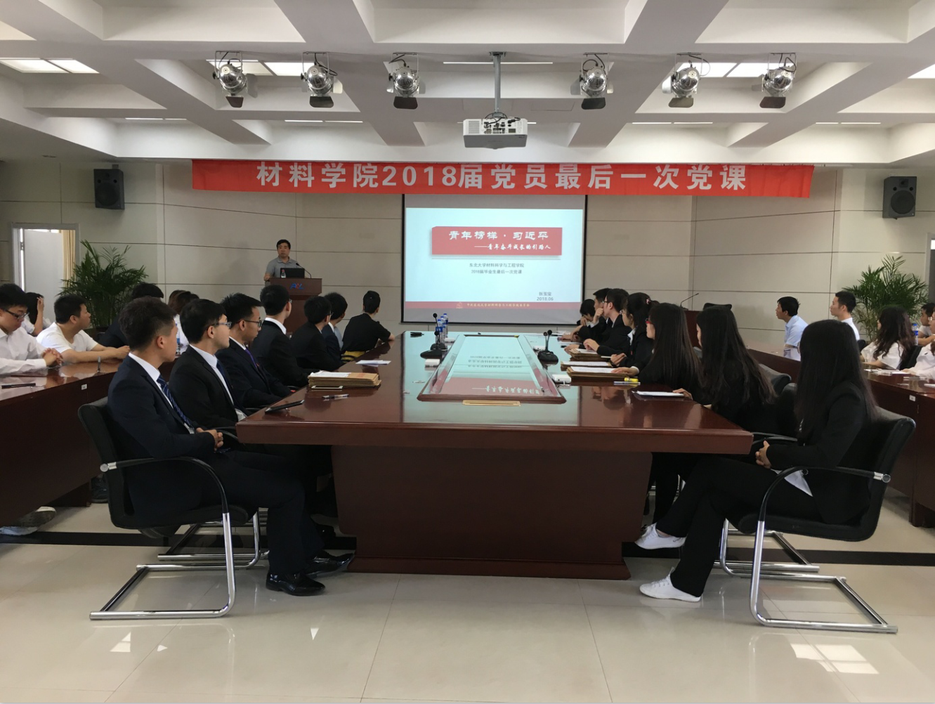 6月21日,东北大学材料学院2018届本科生最后一次党课在东北大学RAL411会议室举办,东北大学材料学院党委书记张玉宝、党委组织员商淼 、东北大学材料学院2014级本科生党支部全体党员以及部分积极分子代表出席本次会议。会议由材料学院2014级本科生党支部书记李潇翔主持。