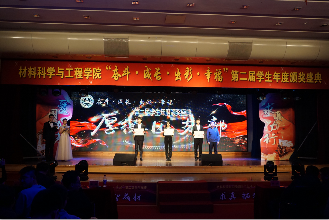 颁奖典礼分为“笃行·奋进材料”、“融汇·团结材料”、“创新·多彩材料”、“筑梦·卓越材料”4个篇章。23个集体分别获得铸智班集体、厚德团支部、卓越寝室和拓新团队4项集体奖,76名同学获得院长奖章、成材创新奖、成材实践奖、成材进步奖、成材励志奖5项个人奖。