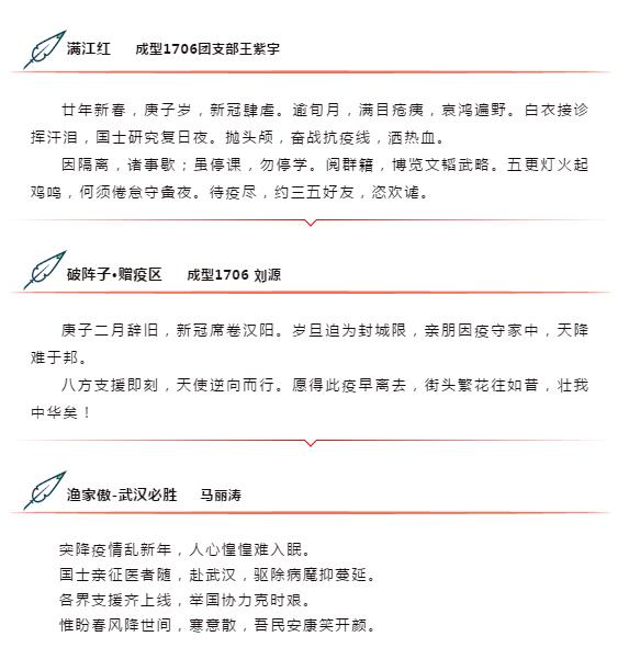 各团支部、广大团员积极响应、主动参与,活动涵盖书香材料阅读温暖今冬、居家战疫爱在点滴、讲述身边的战疫故事、学习防控知识、开展线上志愿服务传播正能量等,同时杜卓洋等多名同学自发参加线下战疫志愿者活动,贡献青春力量。本次团日各年级参与度高、完成质量高、参与效果好,2019级学生响应尤为积极;作品种类丰富、活动形式多样,学生们通过包含原创视频、歌曲、图片、海报、书法、文学作品为武汉加油,向奋斗在一线的医护人员和工作人员致敬。学习防控会议精神,坚定必胜信心信念!
