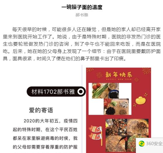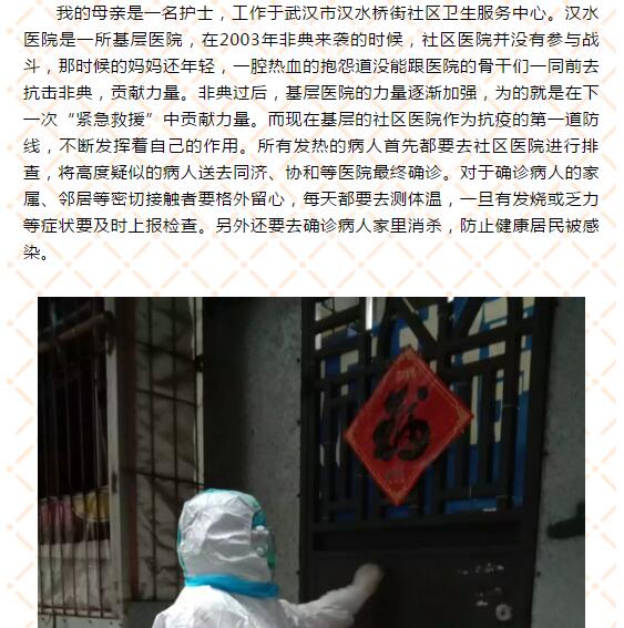 寒假战“疫”期间,材料学院团委开展讲述身边的战“疫”故事活动,将发生在身边的感人故事在线上呈现出来,让温暖、关心与感动在材料学生间传递,引导学生坚定信心,自觉做科学的传播者、谣言的粉碎者、健康的守护者、家庭的关爱者,发出“材料人”的正能量声音。截止目前,共发布《我在湖北,我一切都好!》等7期。
