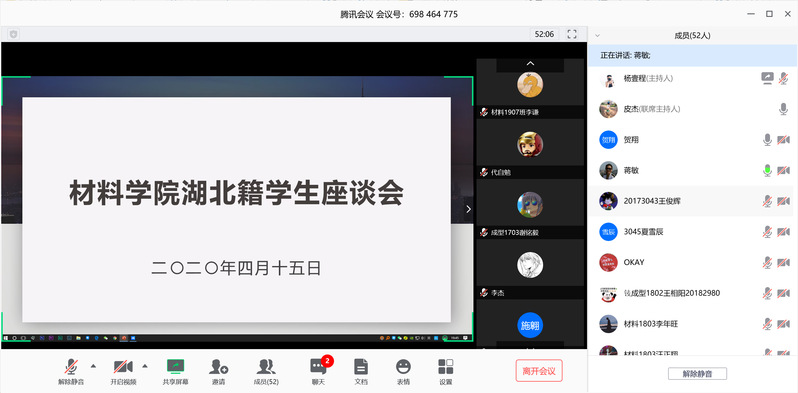 为深入了解疫情期间湖北籍学生学习、生活、就业等状况,切实帮助学生解决实际困难,鼓励学生坚定战胜疫情的信心,4月15日19:00材料学院召开了湖北籍学生网络座谈会。学院教学副院长蒋敏、党委副书记兼副院长贺翔以及各年级辅导员与41名同学参加座谈会。