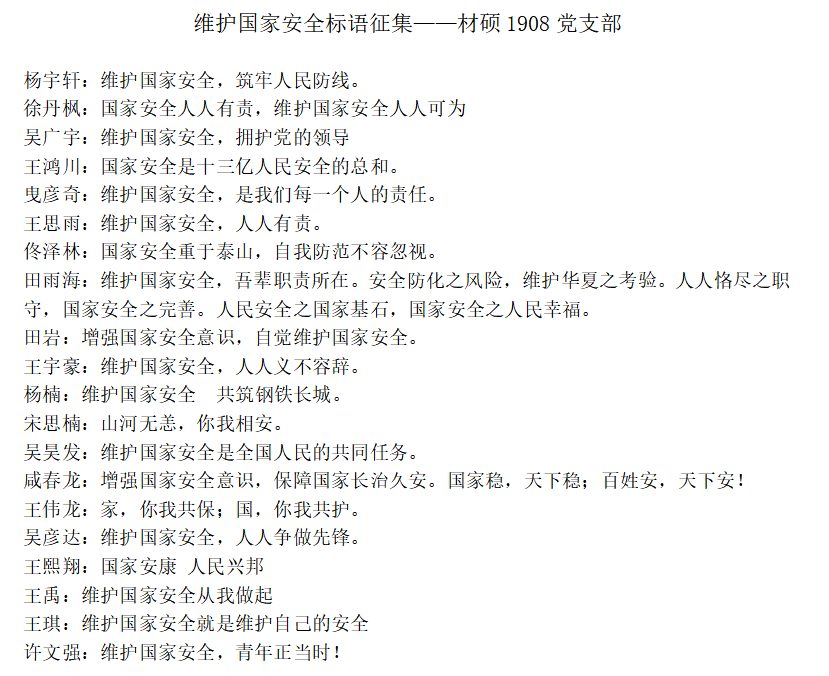 党支部组织收看了《汇聚人民力量 维护国家安全》国家安全教育专题片,并倡导大家写出维护国家安全的标语。在观看完纪录片后,同学们积极提交了发自内心的安全标语,表达了当代青年维护国家安全的坚定决心。同学们深刻意识到国家安全绝不仅仅是军队的事情,无论是军队还是地方,无论是伟大的军人还是普通百姓,在保卫国家安全上都义不容辞。活动结束后,支部成员纷纷表示,要发挥当代青年学生模范带头作用,从小事做起,积极维护国家安全,共建美好家园。