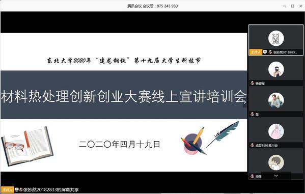 4月19日下午2:00,东北大学“建龙钢铁”大学生材料热处理创新创业大赛线上宣讲会通过腾讯会议成功举办。第五届中国材料热处理创新创业大赛工作人员、轧制技术及连轧自动化国家重点实验室王晨充老师,学院团委书记董磊,双创辅导员杨壹程,第五届中国大学生材料热处理创新创业大赛一等奖团队队长张茜,以及参赛学生参加了本次宣讲培训。