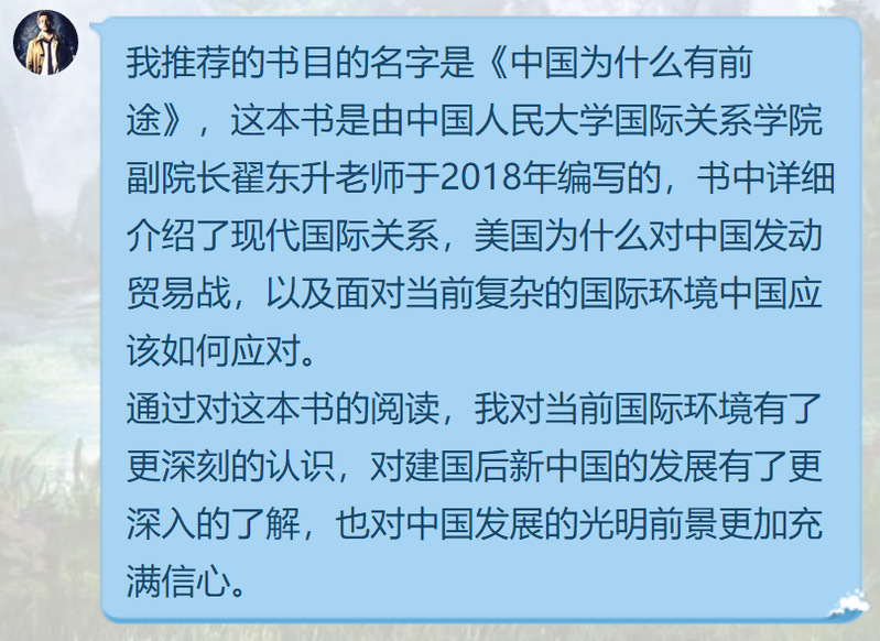 同学们积极响应支部号召,将推荐的书目、推荐理由以及个人读书感悟在线分享给大家,书籍内容涵盖了政治、文学、艺术、历史等多个方面,拓展了同学们的眼界。党支部书记闫渤对同学们推荐的书籍进行了梳理,并建议大家充分利用好居家抗疫时期,在科研学习之余,能够静下心来阅读一本好书,养成爱读书的好习惯。活动结束后,同学们均表示受益匪浅,既拓宽了在读书方面的视野,也激励自己不断提高自身综合素质。
