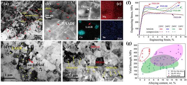 如何大幅度提高低成本(低/无稀土)镁合金的绝对强度,是继续拓宽镁产品实际应用的关键问题。最近几年,东北大学材料学院秦高梧教授团队在镁合金相平衡及热力学计算的基础上,发现了缺陷诱导Ca溶质动态偏聚的晶粒细化新机制,据此成功设计并制备出了力学性能优异的系列Mg-Ca基合金。2015年, Mg-Ca二元合金的抗拉强度可以达到330 MPa,较韩国Kim组报道的同成分Mg-Ca变形合金的强度值提高了~ 100 MPa,延伸率也可以达到~10% (J. Alloys Compd., 2015, 630:272-276)。2017年,基于传统的一步挤压制备了Mg-Ca二元合金,基体的晶粒尺寸可以继续细化至~ 0.7 m,室温抗拉强度因此达到了~ 400 MPa(Mater. Lett., 2019, 237:65-68)。2018年,研发团队在常规挤压的Mg-2Ca-2Sn非稀土合金中发现添加少量的Ca元素即可以诱导Ca在晶界/亚晶界处的偏聚和nano-Mg2Ca的动态析出,通过充分发挥合金化元素以及挤压工艺的细晶作用,最终获得-Mg基体细化至常规挤压难以实现的亚微米尺寸(~ 0.32 m),因此表现出了优异的力学性能(屈服强度~ 443 MPa)(图1)。特别的,该合金可以在~ 4 wt.%的溶质含量下获取超高强,即实现了“高强度低合金化的镁合金”(Acta Materialia, 2018, 149: 350-363)。然而,该合金在高强度下难以兼容良好塑性。