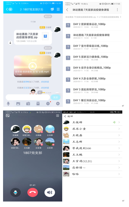 本次活动采取线上视频推送的方式,党支部书记王俊辉播放健身课程视频,该健身视频包括“餐后消食运动、居家暖身运动、晨起肩背舒活、久卧全身舒展、居家活力健身操、徒手全身训练及室内零噪音训练”等七个模块,分别对应七天的健身内容,并发送至QQ群和微信群中。随后,王俊辉组织大家共同观看健身课程视频,同时要求支部全体成员认真学习该健身课程视频,并进行居家健身,线上打卡。