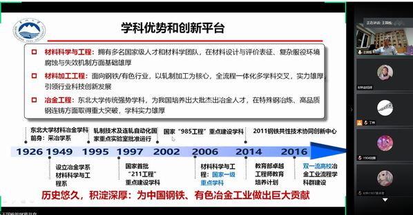 6月8日19:00,材料科学与工程学院举行院士报告会活动。中国工程院院士、东北大学博士生导师王国栋教授通过腾讯会议线上为材料学院大一学生作报告,报告题目为《钢铁工业的绿色化、智能化转型》,材料加工系主任丁桦教授、学院团委书记董磊、2019级辅导员李刚及260余名大一学生参与活动。