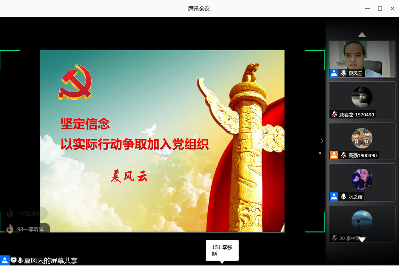 夏风云从正确的入党动机、入党条件以及入党手续等三个方面为同学们详细讲授了积极分子应如何“坚定理想信念,以实际行动争取早日加入党组织”。结合此次疫情,他提到了奋战在一线的医护人员张定宇、赵华等战疫英雄的事迹,教育同学们要向英雄学习,发挥模范带头作用。在观看《共产党员是怎样炼成的》短视频后,夏风云指出,作为大学生入党积极分子,首先的是坚定理想信念,端正入党动机,其次是要加强理论学习,增强党性观念,第三要各方面严格要求自己,时刻准备接受党组织的严格考察和考验。最后,他希望全体学员在今后的学习生活中不断取得新进步,以优异的成绩和突出的表现向党组织汇报,争取早日加入中国共产党。