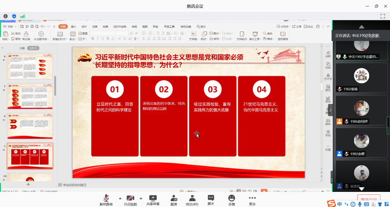 活动伊始,主持人金煜向大家介绍了本次活动的主要内容。积极分子代表李忠豪讲解了习近平新时代中国特色社会主义思想的内涵,包括八个明确与十四个坚持,并结合实际问题从四个方面向全体成员解释了为什么习近平新时代中国特色社会主义思想是党和国家必须长期坚持的指导思想。随后,活动进行了“诵读党章,润物有声”环节,九位同学一起诵读了党章的节选内容,并由积极分子代表刘璐结合《中国共产党章程》节选,带领着全体成员深入学习了党的指导思想。活动最后,大家进行了有关对党的认识以及入党动机的思想汇报分享。