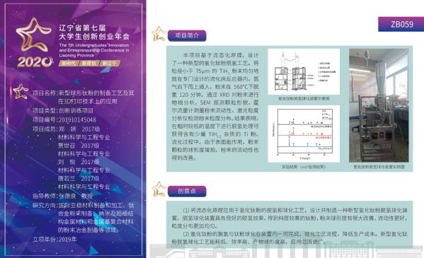 8月26-28日,辽宁省第七届大学生创新创业年会在沈阳大学举行。经现场答辩、成果展示、专家评审,由材料学院张德良教授指导,郑妍、贾世召、刘悦、唐若兰共同完成的论文《新型球形钛粉的制备工艺及其在3D打印技术上的应用》荣获展示项目一等奖和最佳创意项目奖,张德良获评“优秀指导教师”。
