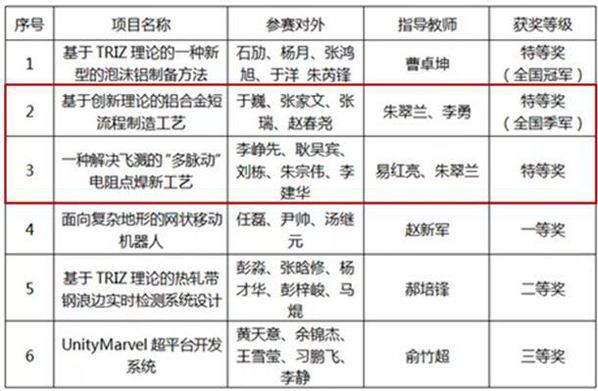10月22日,第四届全国大学生创新方法大赛总决赛成绩揭晓。我院学生喜夺全国总决赛特等奖2项。由创新创业学院朱翠兰老师、RAL国家重点实验室李勇老师指导,材料学院学生于巍、张家文、张瑞、赵春尧共同完成的参赛作品《基于创新理论的铝合金短流程制造工艺》获全国季军、全国特等奖;由RAL国家重点实验室易红亮老师、创新创业学院朱翠兰老师指导,材料学院学生李峥先、耿吴宾、刘栋、朱宗伟、李建华共同完成的参赛作品《一种解决飞溅的“多脉动”电阻点焊新工艺》获全国特等奖。