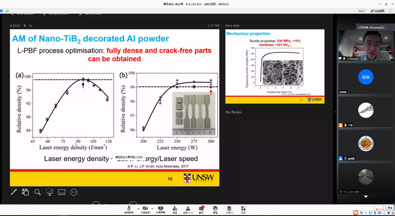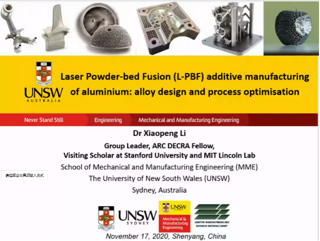 在东北大学国际合作交流处和轧制技术及连轧自动化国家重点实验室支持下,2020年11月17日,应丁桦教授和蔡明晖副教授邀请,澳大利亚新南威尔士大学李晓鹏研究员作了题为“Laser power-bed fusion (L-PBF) additive manufacturing of aluminum: alloy design and process optimization”的学术报告。