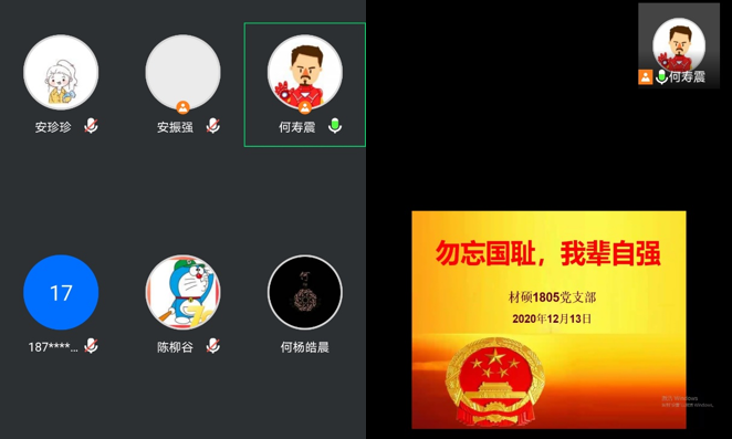 为铭记历史,祭奠逝去的同胞,弘扬爱国主义精神,12月13日上午,材料学院硕士1805党支部通过腾讯会议软件开展“勿忘国耻,我辈自强”国家公祭日宣传教育主题党日活动,支部全体党员参加本次活动。