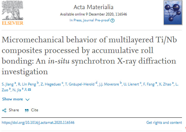 近年来,东北大学材料科学与工程学院贾楠教授课题组在金属层状复合材料的剪切带变形机制和形变微取向演化方面开展了系统的实验表征与数值模拟研究,主要成果发表在Acta Materialia (2013,61:4591-4606; 2014,76:238-251; 2016,111: 116-128)和Journal of Materials Science & Technology (2019, 35: 1165)等SCI期刊上。最近,该课题组在“累积叠轧制备亚微米尺度金属层状复合体的形变微结构演化和受剪切带调控的微观力学行为”方面又取得了新的研究进展,为借助微结构和织构调控来改善金属层状复合材料的力学性能以及对双相/复合材料共变形的研究提供了新的思路。相关结果以题为“Micromechanical behavior of multilayered Ti/Nb composites processed by accumulative roll bonding: An in-situ synchrotron X-ray diffraction investigation”发表在Acta Materialia上。