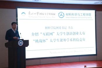 为培养学生“以赛促学”创新意识,激发学生参与竞赛热情,科技节启动仪式后,针对2020年我院学生获奖比例和层次较高的竞赛开展宣讲动员,会议邀请材料学院团委书记董磊针对“互联网+”大学生创新创业大赛、“挑战杯”大学生课外学术科技竞赛等各项创新创业竞赛进行宣讲,鼓励同学们要借助创业类竞赛平台锐意创新、迎接挑战,结合专业相关知识,积极寻找课题、组建队伍,为明年参赛打牢基础。