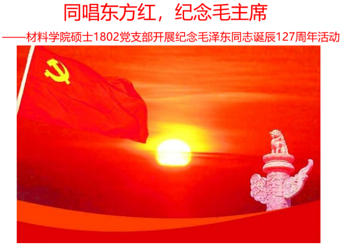 为纪念毛主席诞辰127周年,更好地铭记革命先辈为解放、建设、发展新中国做出的无私奉献,12月26日,材料学院硕士1802党支部开展“同唱东方红,纪念毛主席”主题党日活动,支部全体成员参加了此次活动。