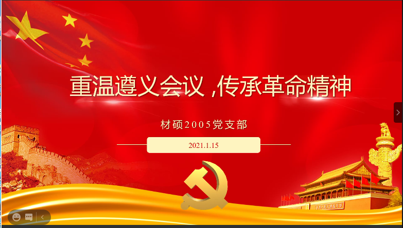 为纪念遵义会议召开86周年,加强支部成员党性修养,1月15日晚,材料学院硕士2005党支部利用腾讯会议组织开展了以“重温遵义会议,传承革命精神”为主题的党日活动,支部全体党员和积极分子参加了此次活动。
