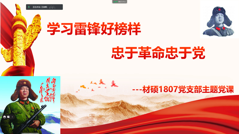 本次党课以线上会议的形式进行,党课伊始,党支部书记王俊辉首先对雷锋同志的事迹进行了讲述,介绍雷锋是如何成为“人民的勤务兵”、“可敬的‘傻子’”、“孩子们的知心人”、“模范班长”,使得支部党员对“雷锋精神”有了更加深刻的认识。随后,支部集体观看了电影《雷锋》,同学们身临其境般地感受到了雷锋同志的平凡与伟大,并纷纷表示要向雷锋学习,做一个有理想、有信仰、为人民服务的合格共产党员。