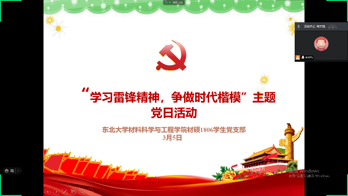 为纪念雷锋同志,弘扬和传承雷锋精神,3月5日中午,材料学院硕士1806党支部在腾讯会议上开展“学习雷锋精神,争当时代楷模”主题党日活动,支部全体党员及部分积极分子参加此次活动。