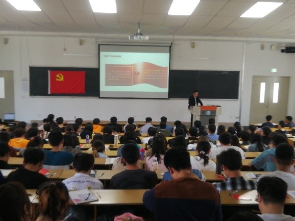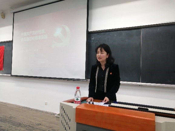 随后,姜玉原为同学们做了本期党校的首次培训,他从中国共产党的性质、最高理想和根本宗旨三个部分展开。在解读中国共产党的性质时,他将中国共产党的性质概括为“一个核心”、“两个先锋”及“三个代表”;在阐释中国共产党的最高理想时,他强调中国共产党的最高理想是实现共产主义,而对于普通人而言,共产主义就是一个美好和谐的社会;在谈到中国共产党的根本宗旨时,他通过讲解抗疫事迹中彰显出来的“生命至上、人民至上”理念,向同学们阐述了中国共产党的宗旨就是全心全意为人民服务。最后,姜玉原以“此生无悔入华夏,共筑时代之伟大”为结束语结束了本场的培训。