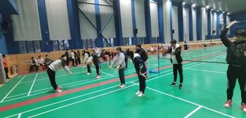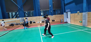 同学们热情高涨,教练为防止同学们受伤在正式运动之前先带领同学们热身和拉伸,为同学们讲解握拍技巧以及基本规则。同学们自由练习,相互切磋,交流心得。