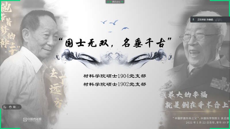 为了缅怀袁隆平、吴孟超两位院士,学习并发扬他们身上的伟大精神,5月23日下午,材料学院硕士1904党支部联合硕士1902党支部线上开展以“国士无双,名垂千古”为主题的缅怀活动,两支部全体成员参加此次活动。