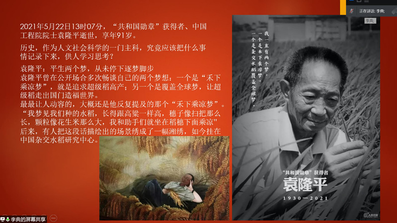 为了深切缅怀袁隆平院士,加深支部成员对其伟大事迹的了解,5月24日,材料学院硕士2002党支部线上举行了以“禾下乘凉梦,一梦便一生”为主题的缅怀活动,支部全体党员及积极分子参加此次活动。