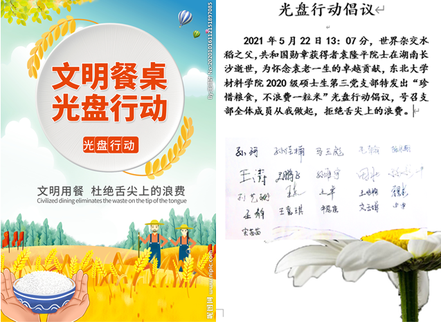为了深切缅怀袁隆平院士,继承和发扬袁老身上的伟大精神,5月23日至5月29日,材料学院硕士2003党支部开展以“缅怀国家脊梁,光盘一起同行”为主题的光盘打卡活动,支部全体党员、积极分子和申请人参加了此次活动。