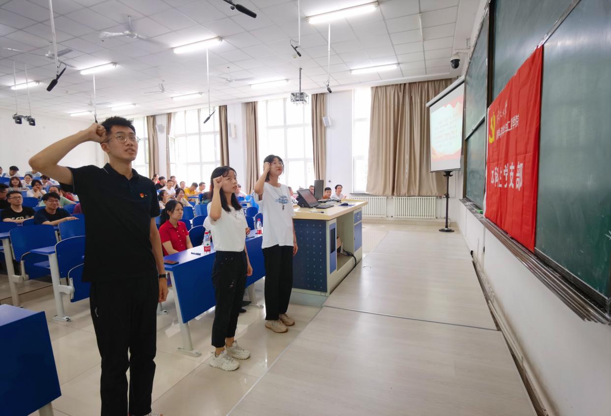 随后,发展对象王晶锐从自己对党员的权利与义务出发阐述了自己对党的性质的理解与思考,并表达了自己加入党组织、为共产主义奋斗终身的决心。经支部委员讨论,有表决权的正式党员以无记名投票方式对韩璐、王晶锐两同志能否入党进行表决,会议全票表决通过接收韩璐、王晶锐两名同志为中共预备党员。最后,组织委员兼纪律检查委员李刚带领新加入组织的两名预备党员面对党旗进行庄严宣誓。