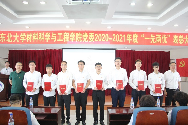 接着,秦高梧宣读了东北大学2019-2021年度“两先两优”评选中获得表彰的集体和个人名单以及材料学院关于表彰2020-2021年度“一先两优”的决定。大会分别对东北大学材料学院91位优秀共产党员、32位优秀党务工作者、15个先进党支部进行表彰,各奖项代表上台接受表彰。