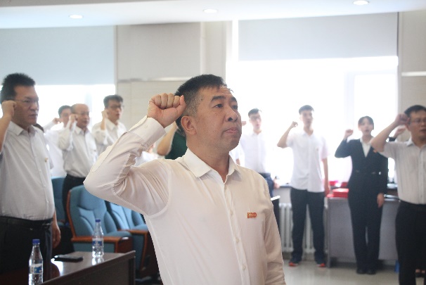 表彰仪式结束后,由张玉宝领誓,全体与会人员重温了入党誓词,党员们目光如炬,誓言铿锵有力。而后,国际歌响起,全体党员庄重严肃,大家心潮澎湃、热血沸腾,在嘹亮、昂扬的歌声中感受到信仰的力量。