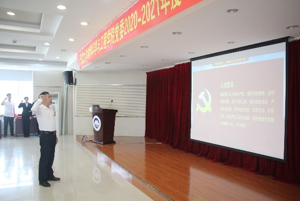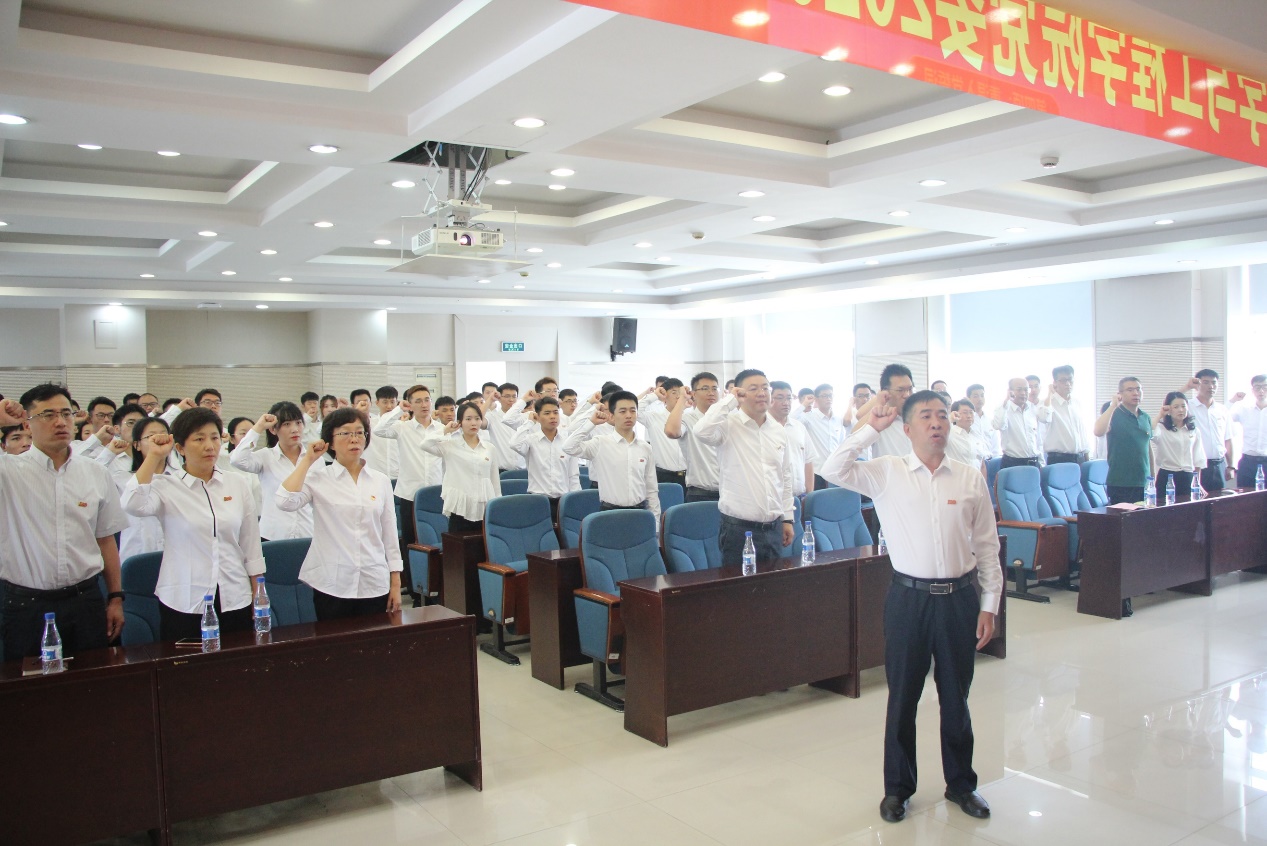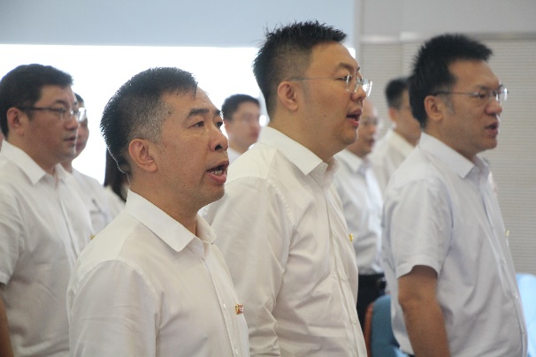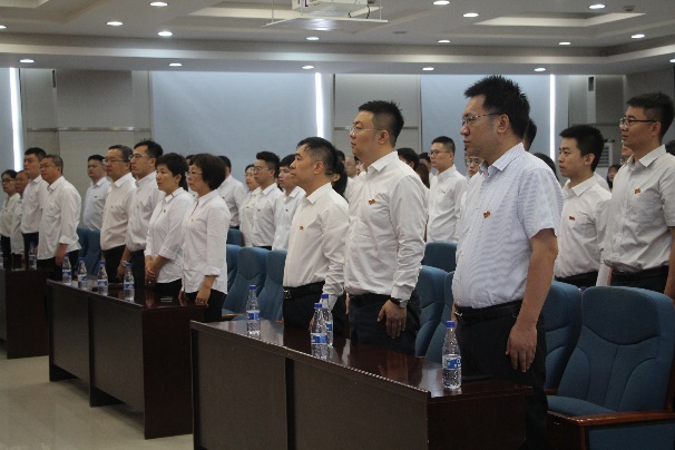 表彰仪式结束后,由张玉宝领誓,全体与会人员重温了入党誓词,党员们目光如炬,誓言铿锵有力。而后,国际歌响起,全体党员庄重严肃,大家心潮澎湃、热血沸腾,在嘹亮、昂扬的歌声中感受到信仰的力量。