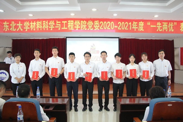 接着,秦高梧宣读了东北大学2019-2021年度“两先两优”评选中获得表彰的集体和个人名单以及材料学院关于表彰2020-2021年度“一先两优”的决定。大会分别对东北大学材料学院91位优秀共产党员、32位优秀党务工作者、15个先进党支部进行表彰,各奖项代表上台接受表彰。