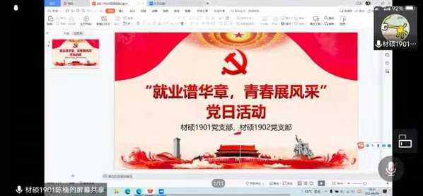 为进一步提升2019级学生党员就业能力,树立正确的人生目标和理想信念,9月29日晚,材料学院硕士1901党支部联合硕士1902党支部开展以“就业谱华章,青春展风采”为主题的线上党日活动,两支部全体成员参加此次活动。