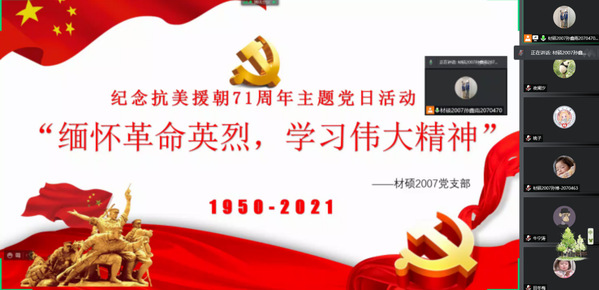 为纪念中国人民志愿军抗美援朝出国作战71周年,10月26日晚,材料学院硕士2007党支部开展以“缅怀革命英烈,学习伟大精神”为主题的党日活动,支部全体成员参加活动。