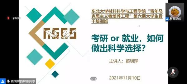 11月10日 中午12:45,东北大学材料学院第六期“青年马克思主义者培养工程”培训班第一课于线上顺利举行,材料学院工会主席、副教授蔡明晖老师担任主讲人,第六期“青马工程”培训班全体学员参与本次讲座。