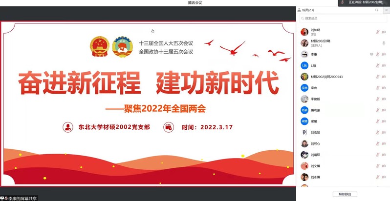 为深入学习贯彻习近平总书记二〇二二年全国两会重要讲话精神,进一步提高党支部成员的政治素养,3月17日晚,材料学院硕士2002党支部开展以“奋进新征程,建功新时代”为主题的线上党日活动,党支部全体成员参加本次活动。