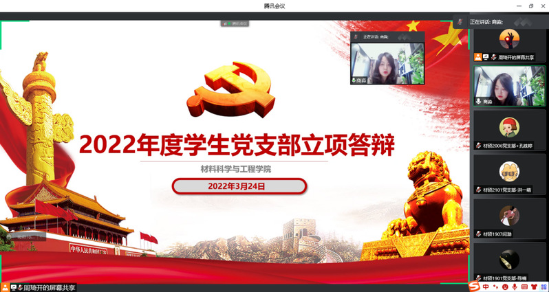 为进一步加强基层党组织建设,全面提升基层党建工作质量,3月24日,材料科学与工程学院学生党总支于线上开展了2022年基层党组织活动方案立项答辩会,材料学院党委副书记兼副院长贺翔、团委书记董磊、党委组织员商淼、学生办公室教师代表及全体学生党支部书记参加会议。