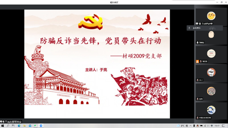 为进一步提升支部成员防骗意识和识骗能力,3月25日晚,材料学院硕士2009党支部于线上开展了以“防骗反诈当先锋,党员带头在行动”为主题的党日活动,支部全体成员参加本次活动。